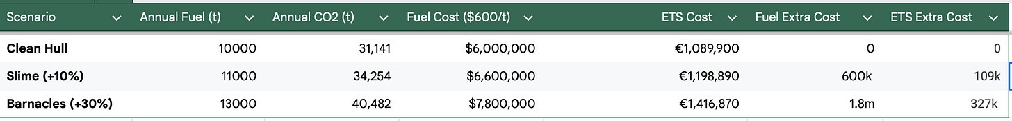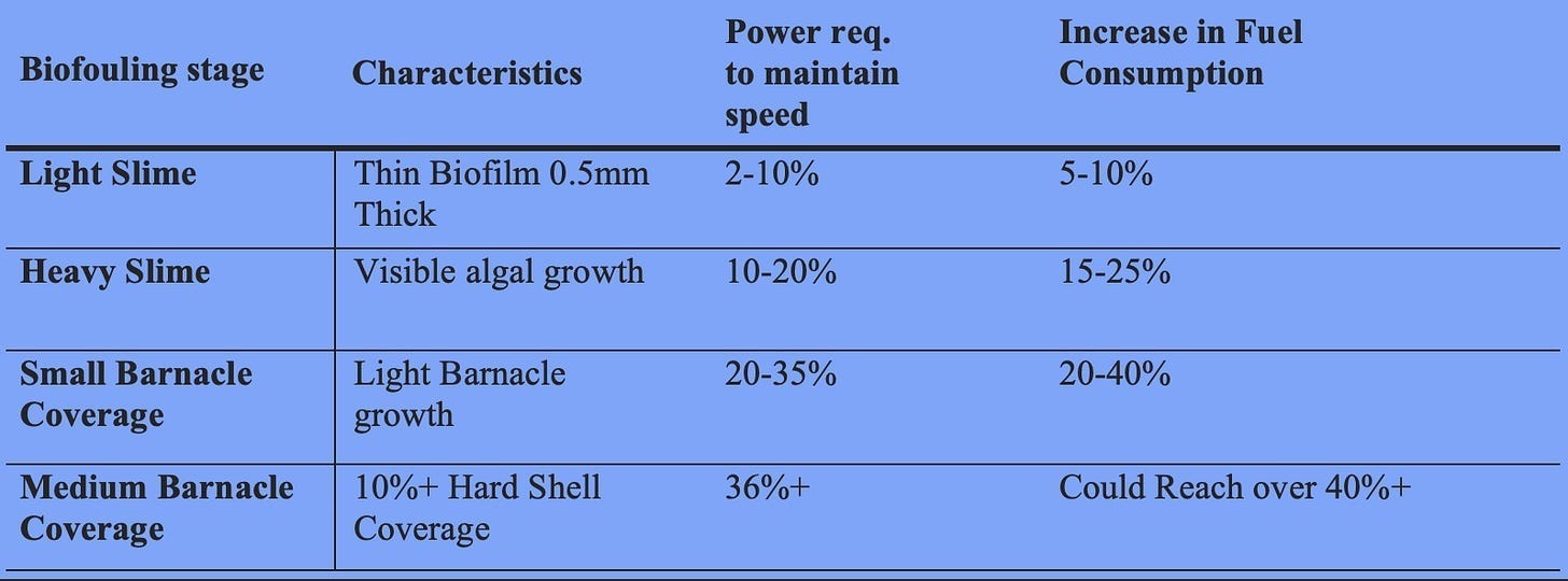 Tankers do not just transport oil, but they often store it. This is a unique feature of the oil market that container ships (carrying standard cargo) don’t have. When a tanker sits at anchor for 30+ days, friction = minimal, the paint stops polishing. A layer of dead paint forms on top, and the copper stops leaching out. When the tanker finally receives an order and tries to move, the hull is covered in hard shells, resulting in massive fuel burn.