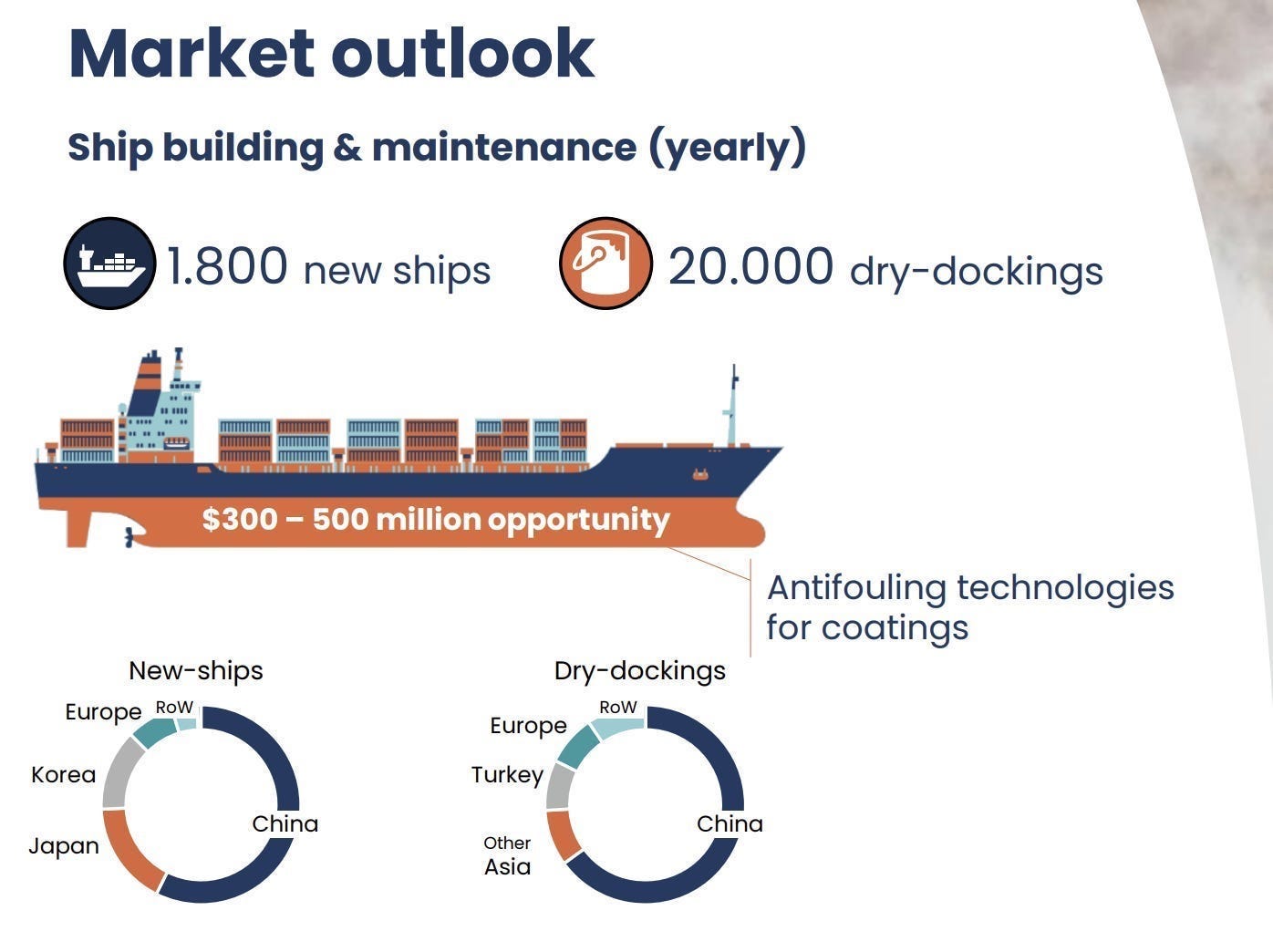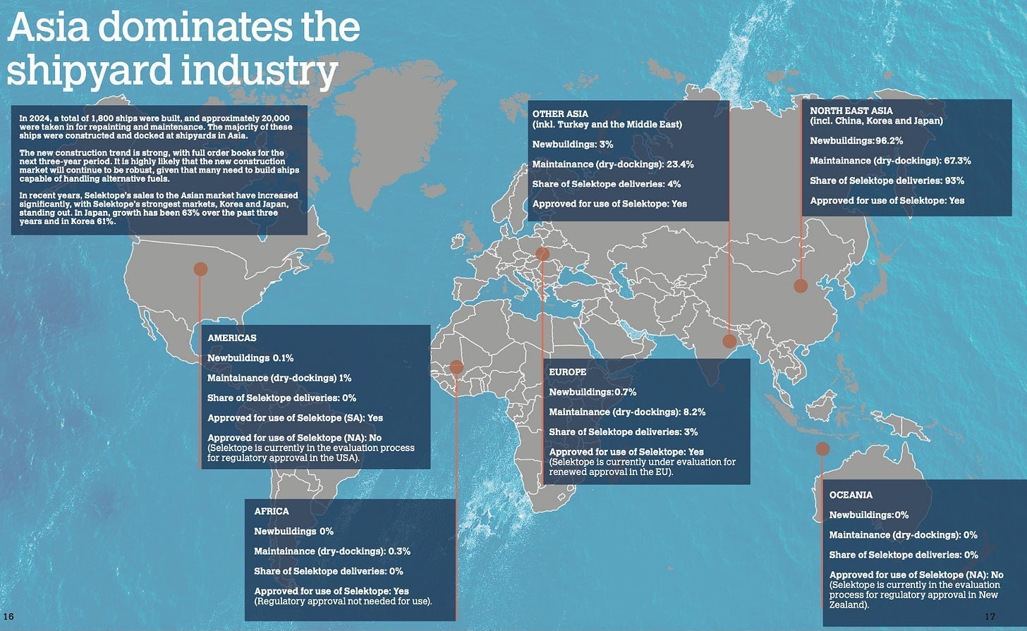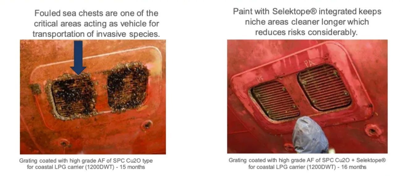 *Binders = The system that acts like the glue that holds the coating together on the ship's hull to ensure the biofouling agent (Selektope in this instance) gets released into the water when the glue itself slowly wears down over time. This ensures long-term performance till the next dry docking (every 5 years if you recall).