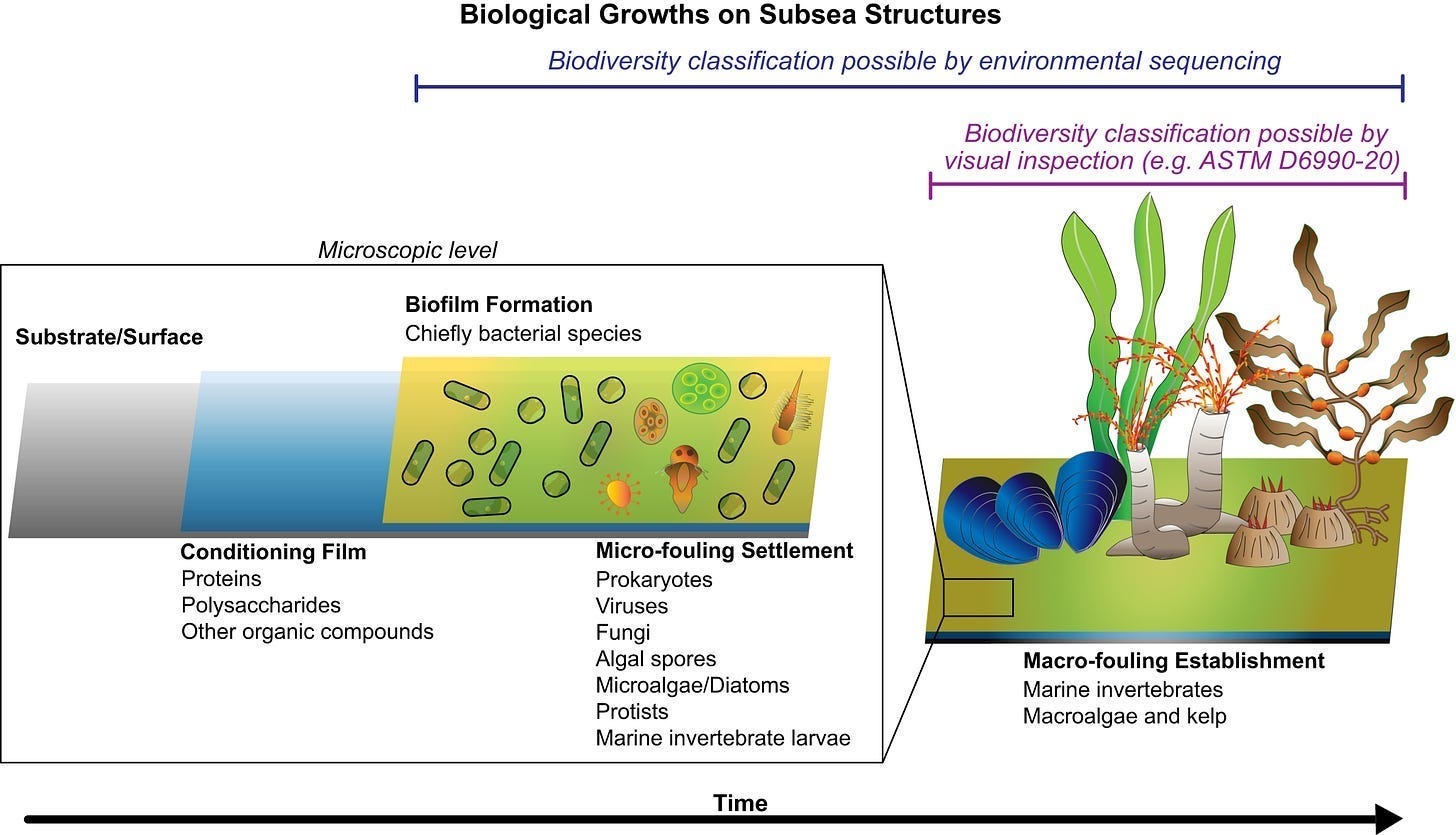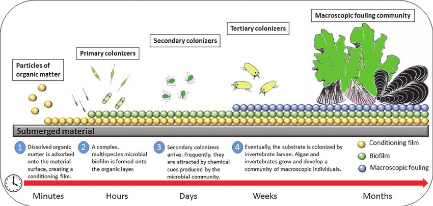 It all begins with the conditioning layers, which are the foundation for what follows, it starts the very minute a ship submerges in the ocean. This film is composed of organic proteins that accumulate on the surface, forming a sticky layer that allows bacteria and diatoms to colonize and create slimy biofilm matrix over the next few hours. This enables the chemical and physical settlement of the real issue, heavy macro-foulers like barnacles and mussels in the weekly stage, which create the real issue for the ship industry, more on that in a bit.